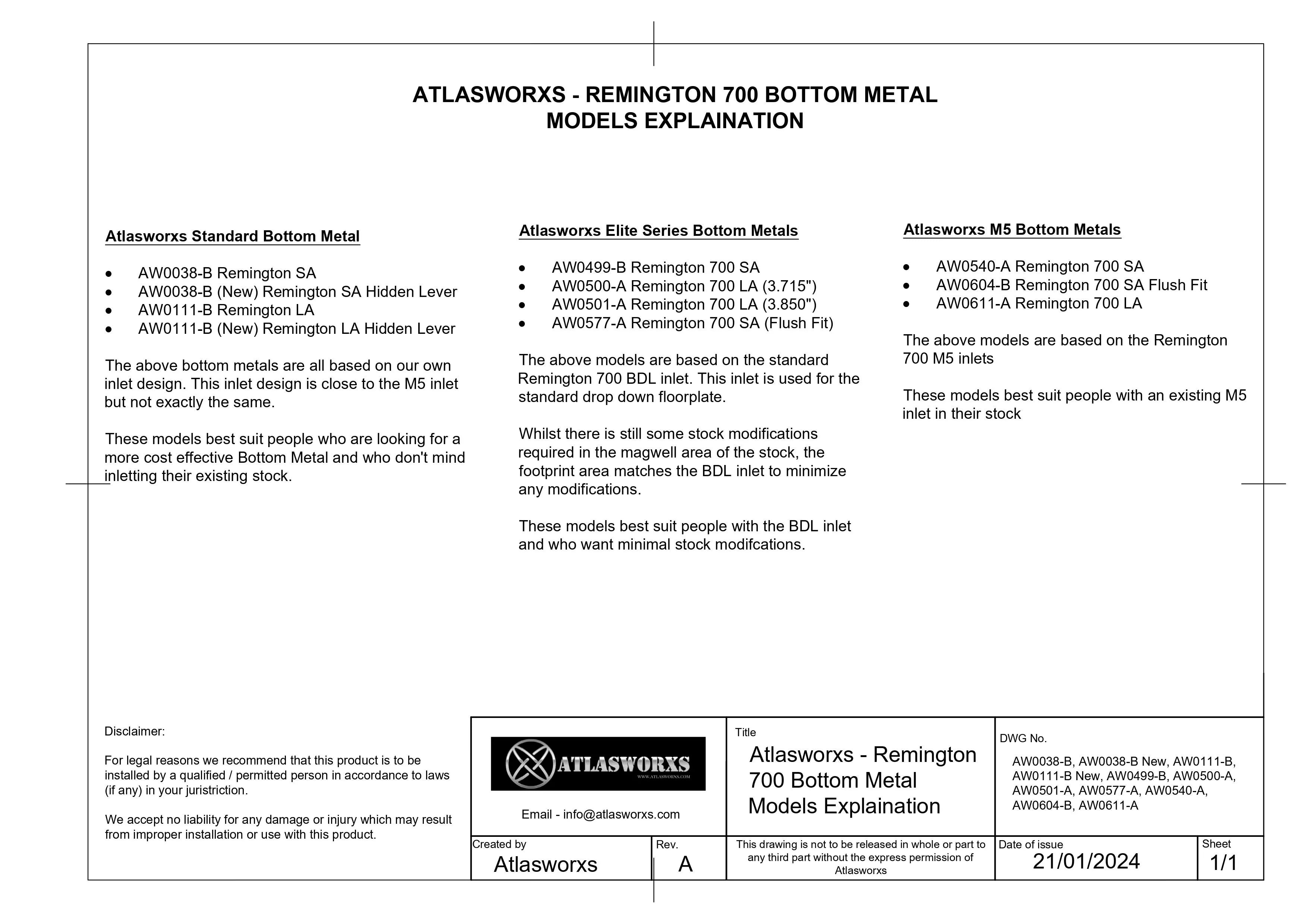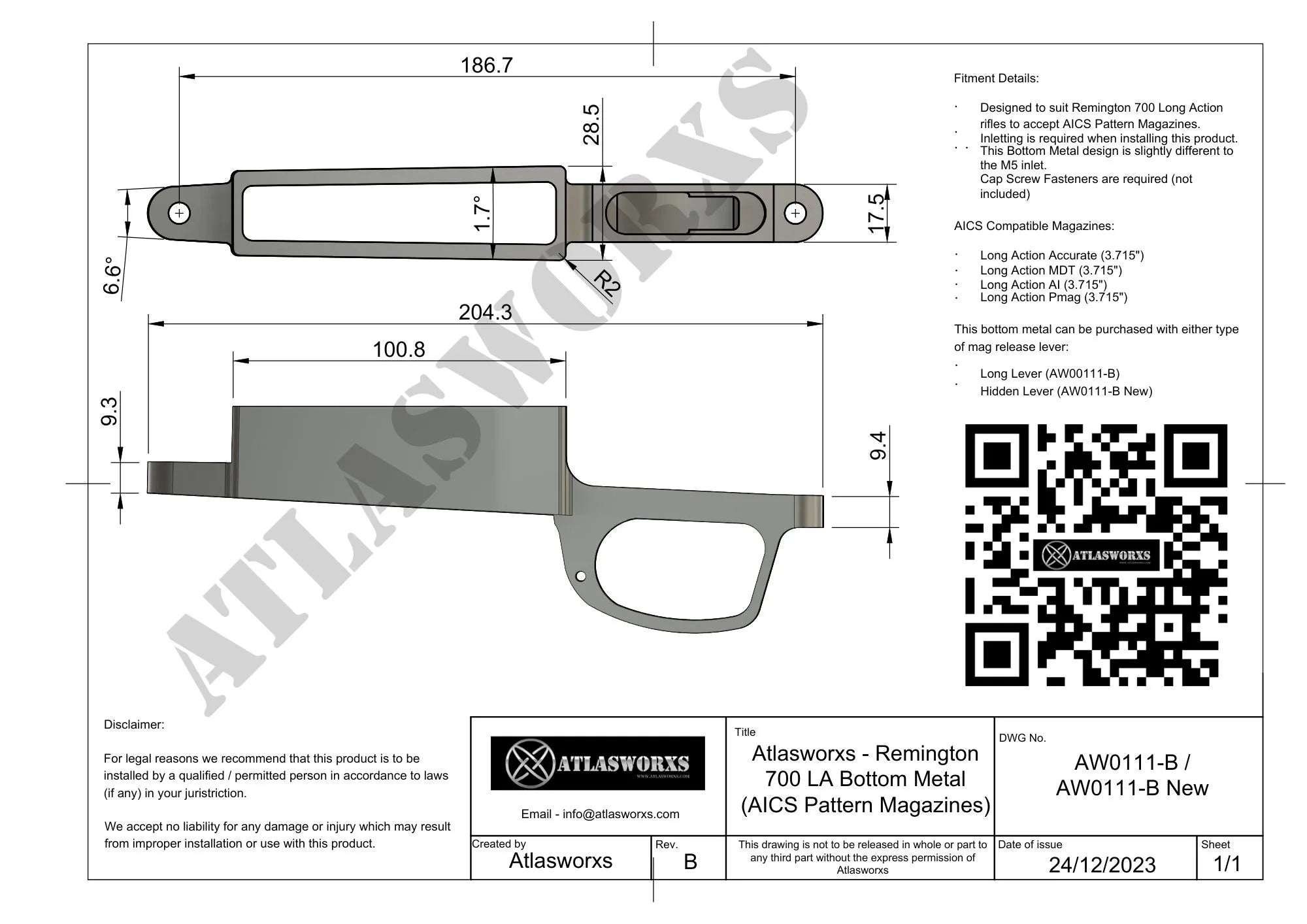 Atlasworxs Bottom Metal / DBM (AICS) – Remington 700 Long Action (AW0111-B Hidden Lever)