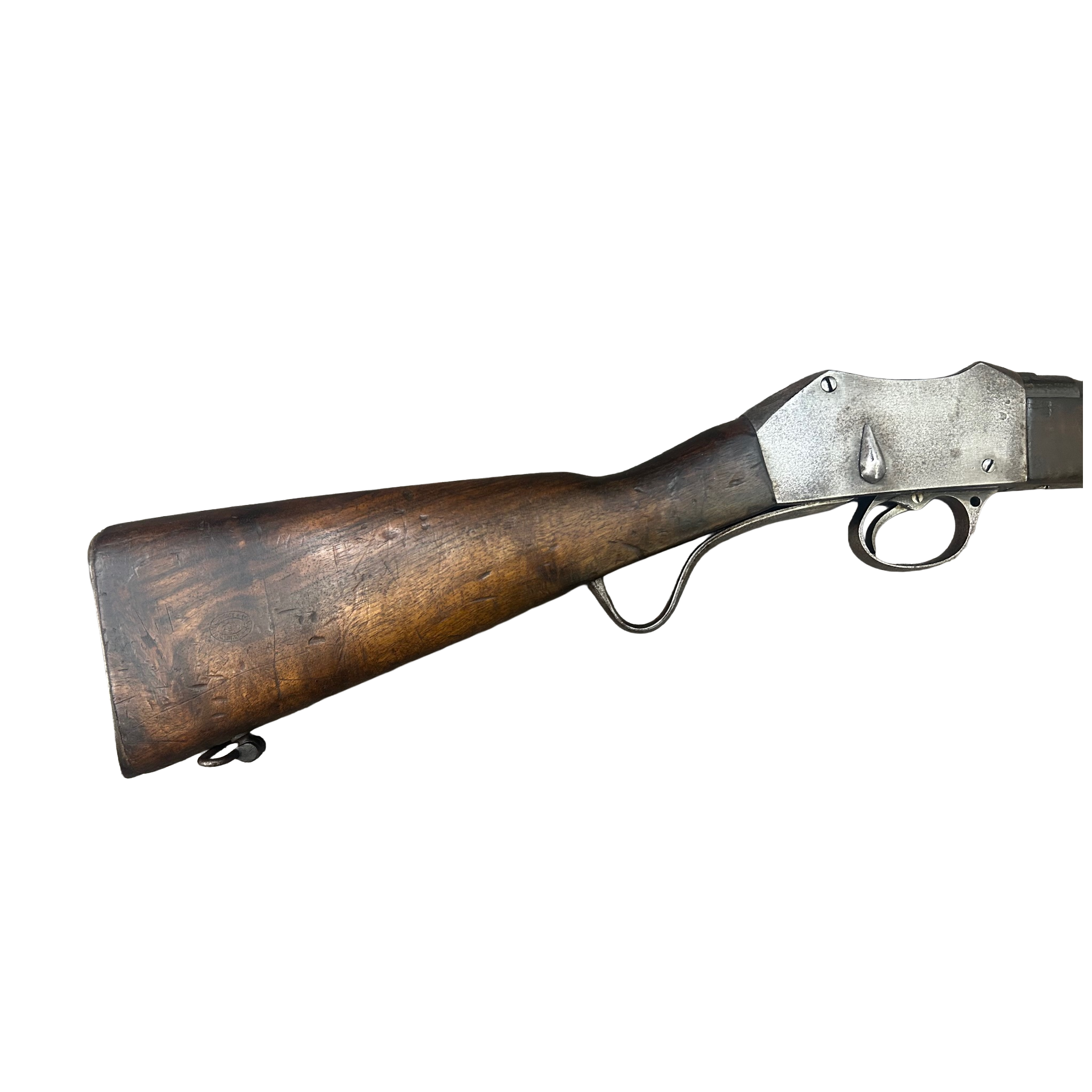 - The right-hand side of the rifle's butt stock is stamped with a small oval marking featuring the Red Hand of Ulster, along with the text "U.V.F. For God And Ulster" inside.