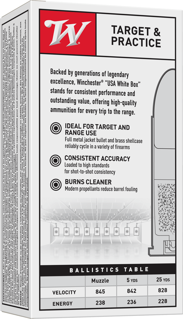 Winchester® Ammunition's USA White Box ammunition is backed by generations of legendary excellence and is a high-quality ammunition that suits a wide range of needs for handgun shooters. This ammunition offers consistent accuracy for target and range shooting. It also provides reduced barrel fouling, which means fewer cleanings and more time on the range.