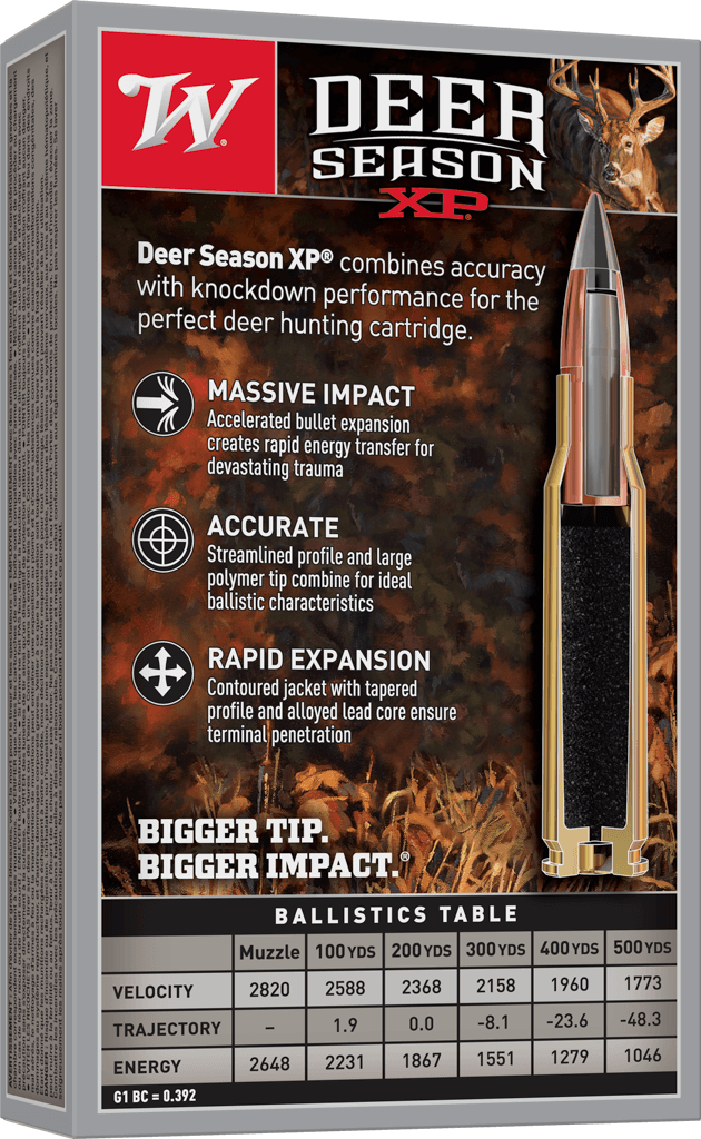 Winchester® Ammunition's Deer Season XP range combines their extensive experience into a product engineered specifically for deer hunters. The polymer-tip Extreme Point bullet features an oversized impact diameter, offering you more impact trauma, better energy transfer, and larger wound cavities to ensure faster knockdown.