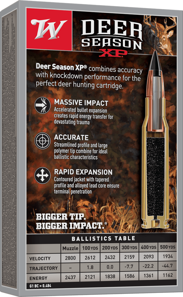 Winchester® Ammunition's Deer Season XP range combines their extensive experience into a product engineered specifically for deer hunters. The polymer-tip Extreme Point bullet features an oversized impact diameter, offering you more impact trauma, better energy transfer, and larger wound cavities to ensure faster knockdown.