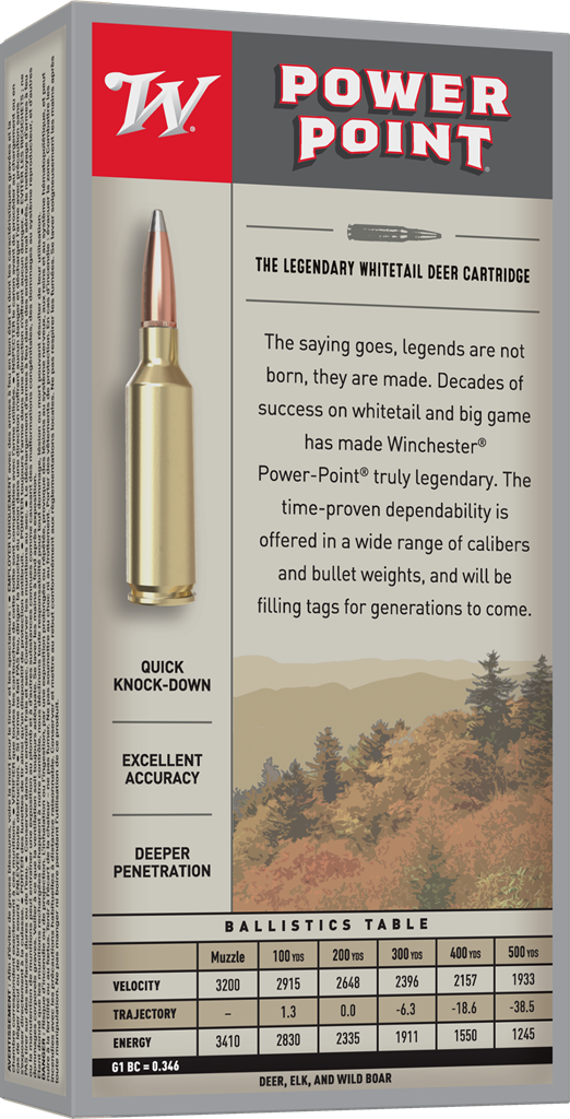Winchester® Ammunition's Power-Point ammunition has decades of success on whitetail and big game, cementing its status as a truly legendary cartridge. The time-proven dependability is offered in a wide range of calibers and bullet weights, and will be filling tags for generations to come.