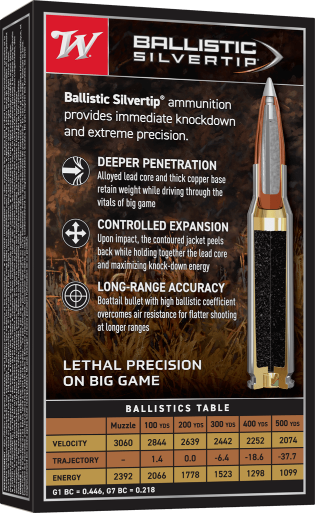 Winchester® Ammunition's Ballistic Silvertip ammunition provides hunters with immediate knockdown and extreme precision. The polymer tip resists deformation, maximizes long-range performance and promotes expansion. The boat-tail design enhances accuracy and an alloyed lead core provides increased weight retention for deeper penetration.