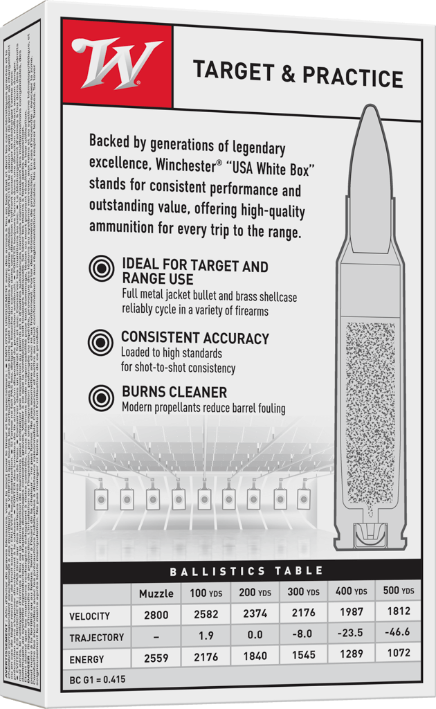 Winchester® Ammunition's USA White Box is high-quality ammunition that suits a wide range of needs for high-volume rifle shooters. The centerfire rifle ammunition incorporates a full metal jacket bullet for positive functioning and no expansion. This ammunition offers consistent accuracy for target and range shooting. It also provides reduced barrel fouling, which means fewer cleanings and more time on the range.