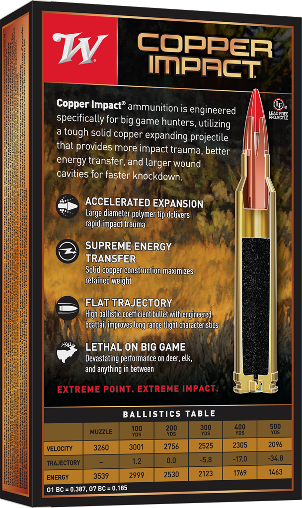 Winchester® Ammunition's Copper Impact® ammunition is engineered specifically for big game hunters, utilizing a tough solid copper expanding projectile that provides more impact trauma, better energy transfer, and larger wound cavities for faster knockdown.