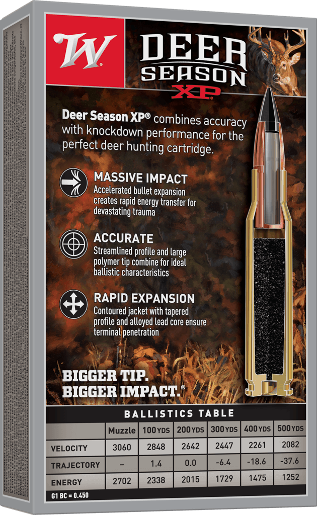 Winchester® Ammunition's Deer Season XP range combines their extensive experience into a product engineered specifically for deer hunters. The polymer-tip Extreme Point bullet features an oversized impact diameter, offering you more impact trauma, better energy transfer, and larger wound cavities to ensure faster knockdown.