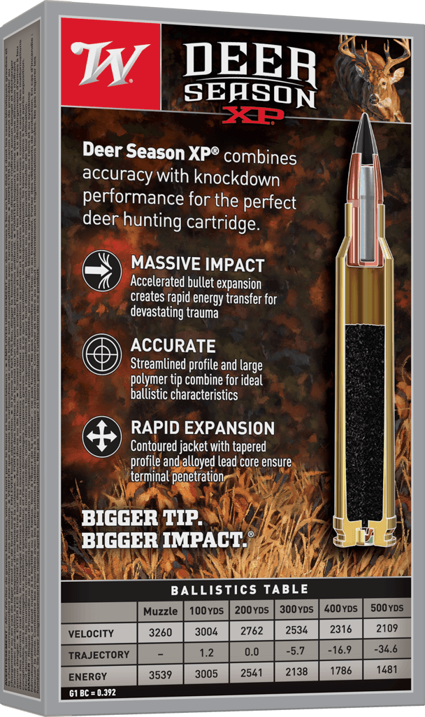 Winchester® Ammunition's Deer Season XP range combines their extensive experience into a product engineered specifically for deer hunters. The polymer-tip Extreme Point bullet features an oversized impact diameter, offering you more impact trauma, better energy transfer, and larger wound cavities to ensure faster knockdown.