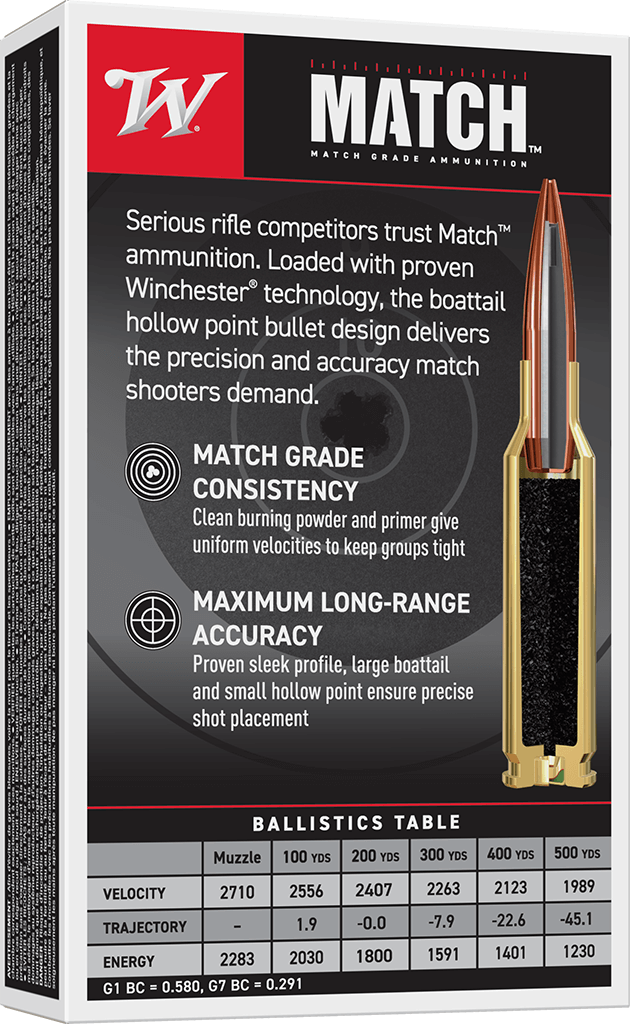 Winchester® Ammunition's Match ammunition offers serious accuracy for the serious marksmen, The sleek bullet profile, large boat-tail, and small hollow point combine to make Winchester Match one of the most sought after rounds on the market. These qualities ensure long-range accuracy even in challenging atmospheric conditions. This ammunition redefines accuracy.