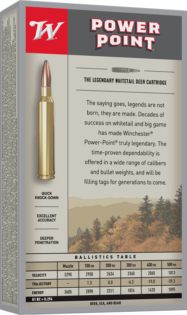 Winchester® Ammunition's Power-Point ammunition has decades of success on whitetail and big game, cementing its status as a truly legendary cartridge. The time-proven dependability is offered in a wide range of calibers and bullet weights, and will be filling tags for generations to come.