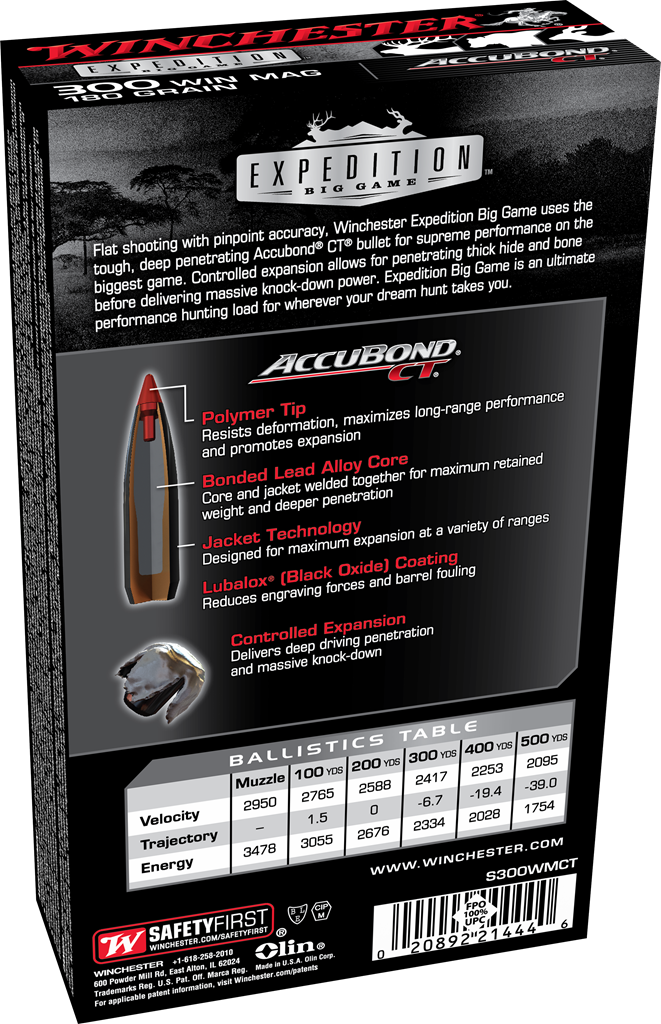 Winchester® Ammunition's Expedition Big Game ammunition uses the tough, deep penetrating Accubond CT bullet for supreme performance on the biggest of game. Controlled expansion allows for penetrating thick hide and bone before delivering massive knockdown power. A polymer tip helps resist deformation and maximizes long-range performance, also promoting expansion. A bonded, lead-alloy core allows for deeper penetration and retained weight.