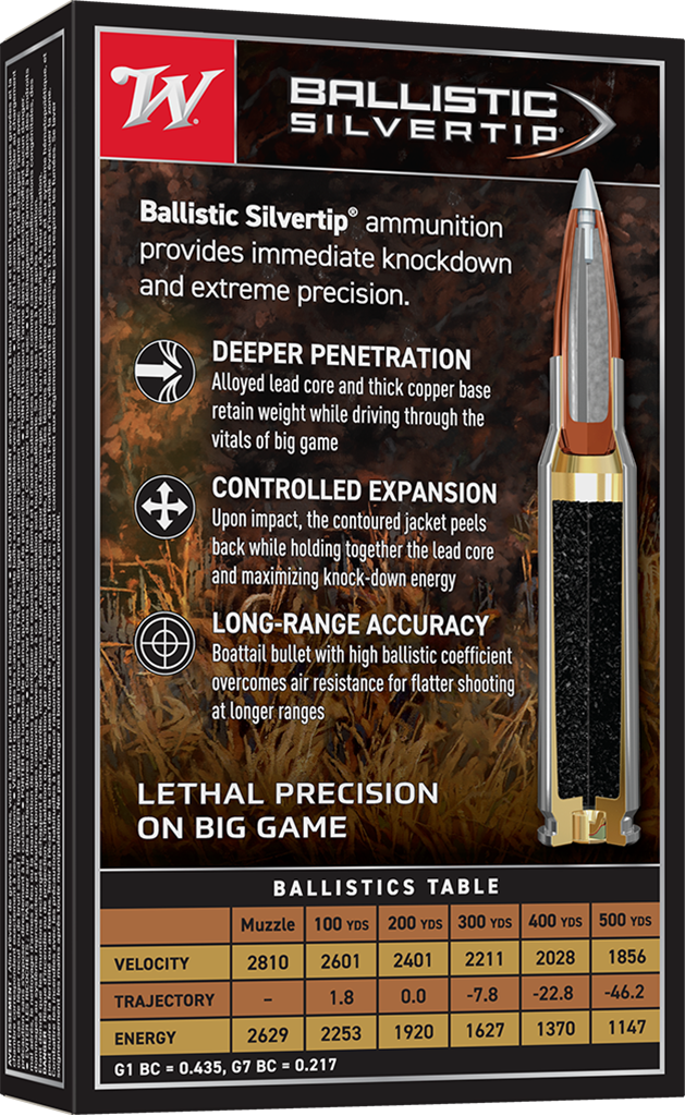 Winchester® Ammunition's Ballistic Silvertip ammunition provides hunters with immediate knockdown and extreme precision. The polymer tip resists deformation, maximizes long-range performance and promotes expansion. The boat-tail design enhances accuracy and an alloyed lead core provides increased weight retention for deeper penetration.
