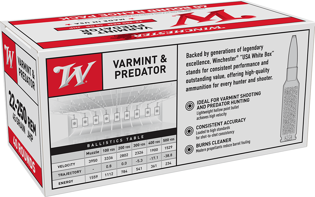 Winchester USA White Box Ammunition 22-250 Remington 45 Grain Jacketed Hollow Point (40pk) Winchester USA White Box Ammunition 22-250 Remington 45 Grain Jacketed Hollow Point (40pk)